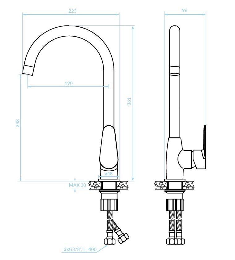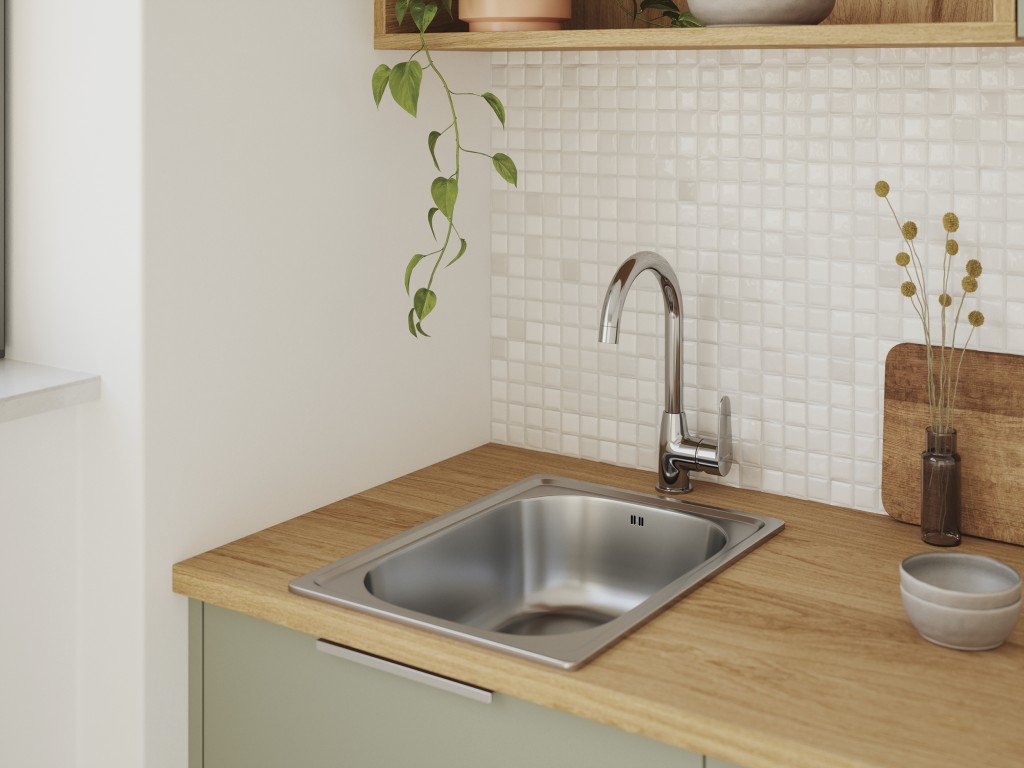 Kuchynská batéria v chrómovom prevedení predstavuje spojenie moderného designu a maximálnej funkčnosti. Vďaka vysokému výtoku (361 mm) a otočnému ramenu s dosahom 190 mm je ideálny na pohodlné umývanie riadu aj plnenie väčších nádob. Keramická kartuša s priemerom 35 mm zaisťuje plynulú reguláciu prietoku a teploty vody.