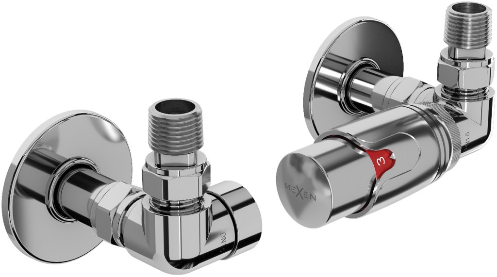 Termostatická sada ventilov (s nastaviteľným ovládaním označeným "MEXEN" a číselným indikátorom) k radiátorom vrátane okrúhlych rozetiek. Výrobca MEXEN túto termostatickú sadu ponúka vo farebnom prevedení: chróm, biela, zlato, antracit a čierna.