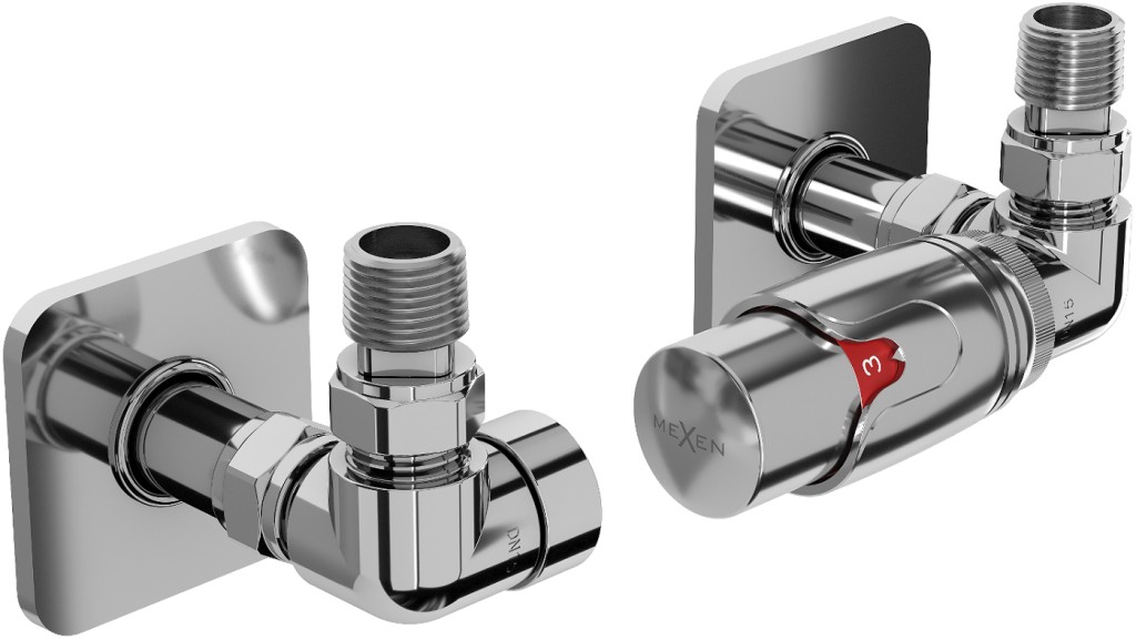 Termostatická sada ventilov (s nastaviteľným ovládaním označeným "MEXEN" a číselným indikátorom) k radiátorom vrátane hranatých rozetiek. Výrobca MEXEN túto termostatickú sadu ponúka vo farebnom prevedení: chróm, biela, zlato, antracit a čierna.