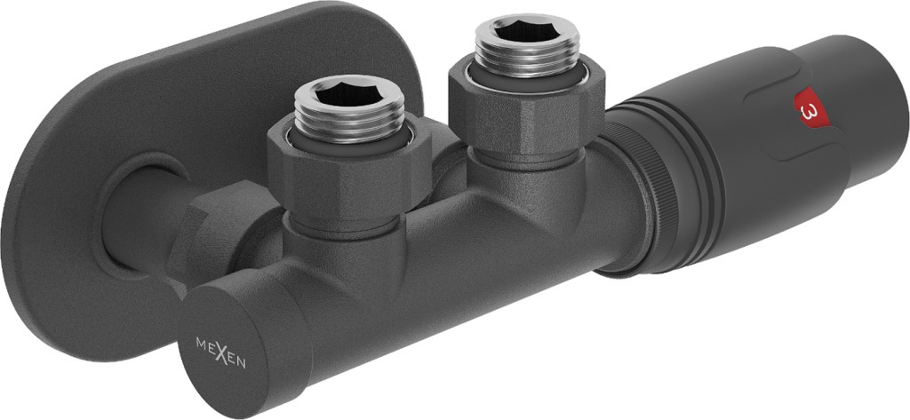 Termostatická uhlová súprava série G00 je určená na pripojenie radiátorov. Súčasťou súpravy je: mosadzný, uhlový ventil Uni-term pre radiátor s rozstupom 50 mm, obojstranný, pre stredové pripojenie s priemerom G1/2", krycia rozetka z nerezovej ocele 115 x 65 x 7 mm otvorov okolo pripojovacích rúrok vedúcich k radiátoru s mosadznými puzdrami, termostatická hlavica so stupnicou 0-5, hlavový závit M30 x 1,5 mm.