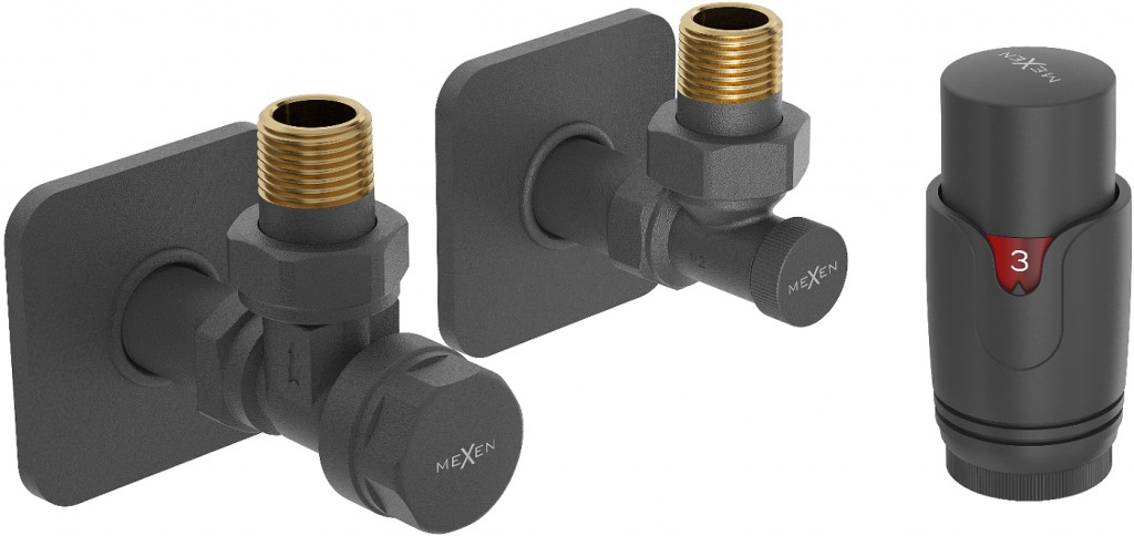 Termostatická sada ventilov (s nastaviteľným ovládaním označeným "MEXEN" a číselným indikátorom) k radiátorom vrátane hranatých rozetiek. Výrobca MEXEN túto termostatickú sadu ponúka vo farebnom prevedení: chróm, biela, zlato, antracit a čierna.