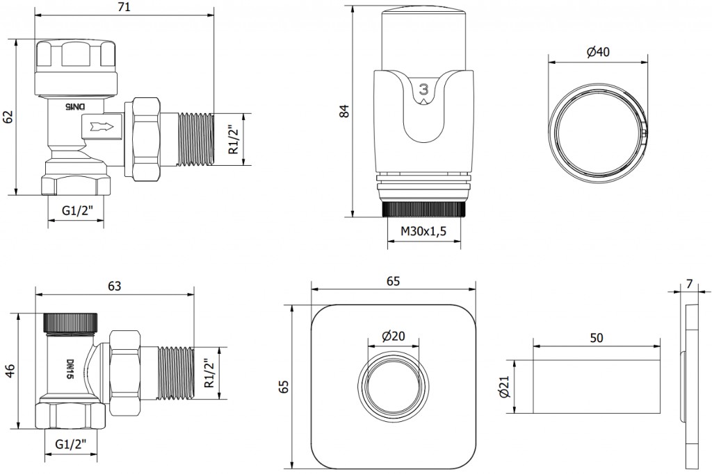 Termostatická uhlová súprava série G00 je určená na pripojenie radiátorov. Súčasťou súpravy je: mosadzný, uhlový ventil Uni-term pre radiátor pre pripojenie s priemerom G1/2", 2x krycia rozetka z nerezovej ocele s rozmerom 65x65 mm s otvormi okolo pripojovacích trubiek vedúcich k radiátoru s mosadznými puzdrami, termostatická hlavica so stupnicou 0-5, hlavový závit M30 x 1,5 mm.