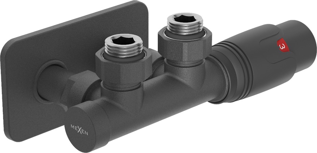 Termostatická uhlová súprava série G00 je určená na pripojenie radiátorov. Súčasťou súpravy je: mosadzný, uhlový ventil Uni-term pre radiátor s rozstupom 50 mm, obojstranný, pre stredové pripojenie s priemerom G1/2", krycia rozetka z nerezovej ocele 115 x 65 x 7 mm otvorov okolo pripojovacích rúrok vedúcich k radiátoru s mosadznými puzdrami, termostatická hlavica so stupnicou 0-5, hlavový závit M30 x 1,5 mm.