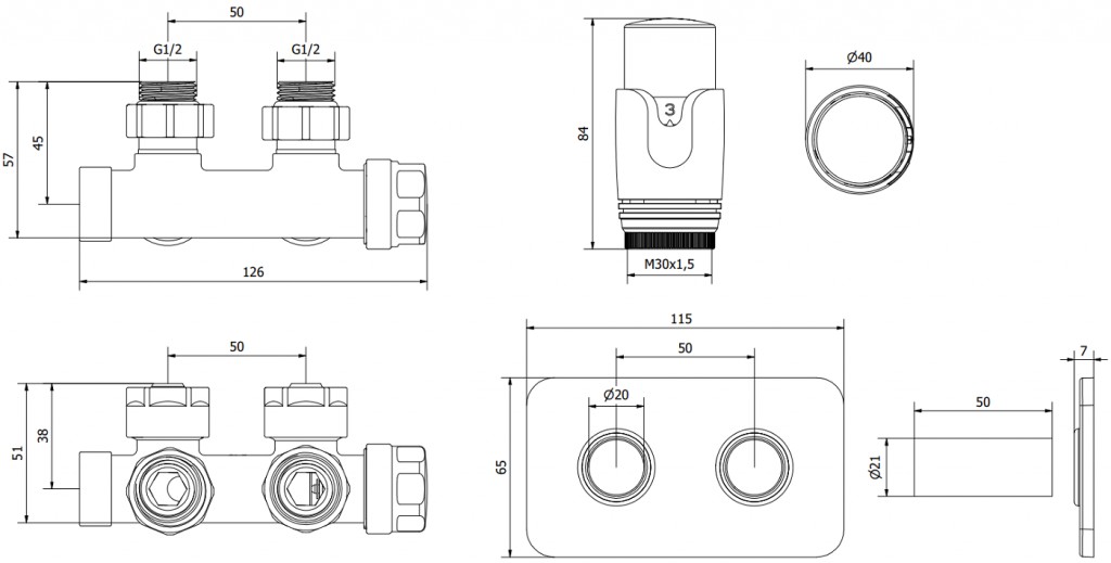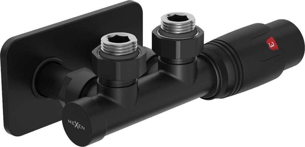 Termostatická uhlová súprava série G00 je určená na pripojenie radiátorov. Súčasťou súpravy je: mosadzný, uhlový ventil Uni-term pre radiátor s rozstupom 50 mm, obojstranný, pre stredové pripojenie s priemerom G1/2", krycia rozetka z nerezovej ocele 115 x 65 x 7 mm otvorov okolo pripojovacích rúrok vedúcich k radiátoru s mosadznými puzdrami, termostatická hlavica so stupnicou 0-5, hlavový závit M30 x 1,5 mm.