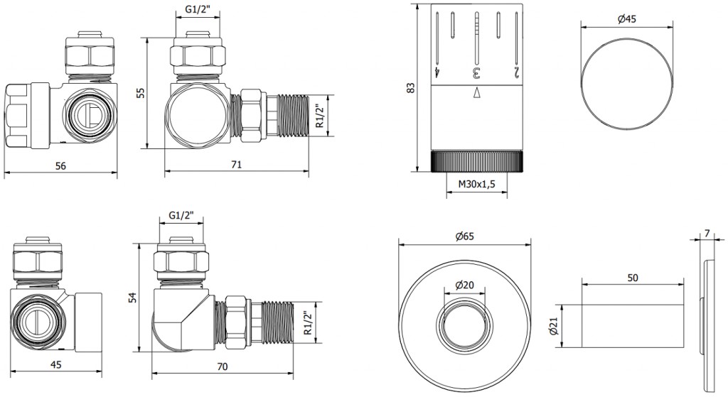 Termostatická sada ventilov (s nastaviteľným ovládaním označeným "MEXEN" a číselným indikátorom) k radiátorom vrátane okrúhlych rozetiek. Výrobca MEXEN túto termostatickú sadu ponúka vo farebnom prevedení: chróm, biela, zlato, antracit a čierna.