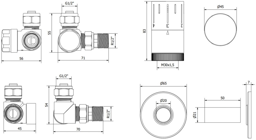 Termostatická sada ventilov (s nastaviteľným ovládaním označeným "MEXEN" a číselným indikátorom) k radiátorom vrátane okrúhlych rozetiek. Výrobca MEXEN túto termostatickú sadu ponúka vo farebnom prevedení: chróm, biela, zlato, antracit a čierna.