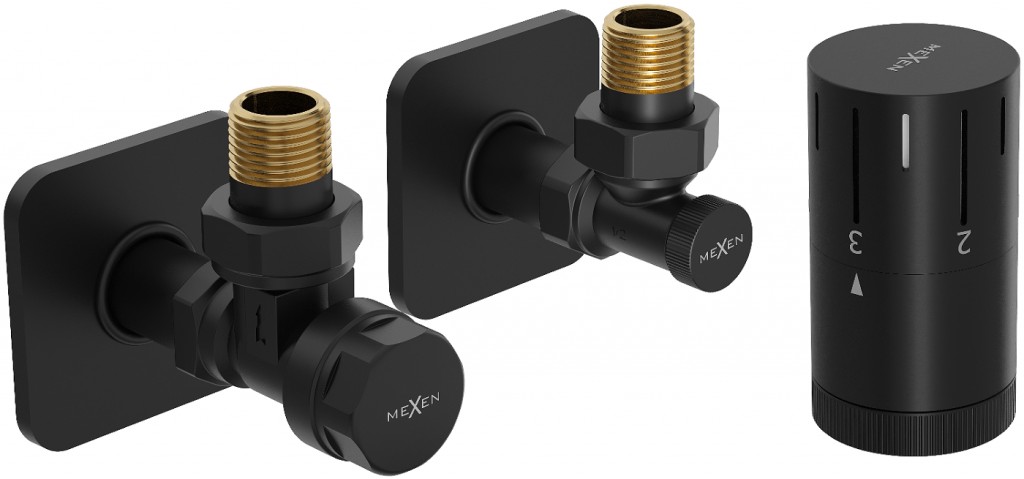 Termostatická sada ventilov (s nastaviteľným ovládaním označeným "MEXEN" a číselným indikátorom) k radiátorom vrátane hranatých rozetiek. Výrobca MEXEN túto termostatickú sadu ponúka vo farebnom prevedení: chróm, biela, zlato, antracit a čierna.