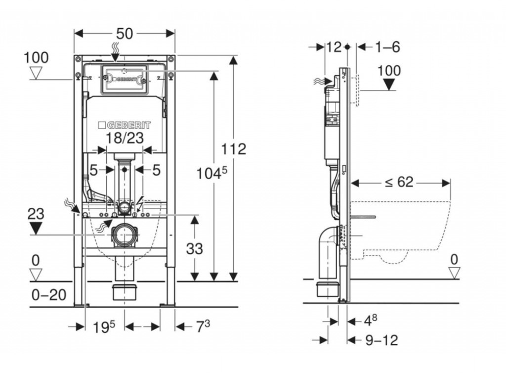 - rám pre nástenné WC s pripojovacími rozmermi podľa EN 33 a presahom do 62 cm