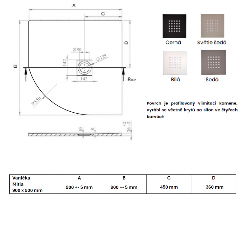 Vanička z liateho mramoru MITIA sa vyrába v rozmere od 1200x700 do 2000x900mm, výška 30 mm. Veľká výhoda tejto vaničky je jej možnosť úpravy rozmeru rezaním (napr. neštandardná šírka niky je s vaničkou MITIA veľmi ľahko riešiteľný problém).