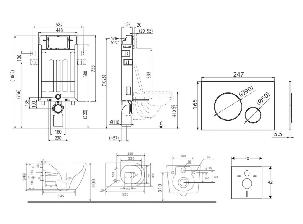 - Fixačný set na uchytenie WC misy: závitová tyč M12 – 2 ks, podložky – 4 ks, krytka – 2 ks, matica – 2 ks, chránička závitu – 2 ks