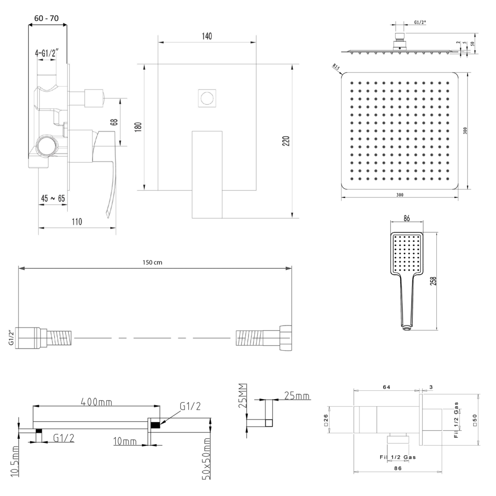 SAPHO - Sprchové ramienko hranaté nízké, 400, čierna mat (SL102)