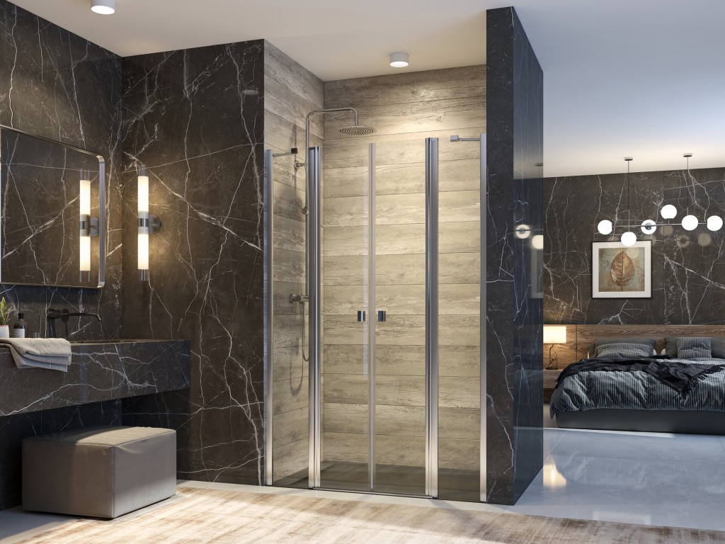 Dvere do niky série GLASS su chytením pántov v profile a 6mm silné bezpečnosní sklo .Dvoukřídlé dvere sú doplnené pevnými dielmi pre širokú niku o rozmere 100,5-125cm.