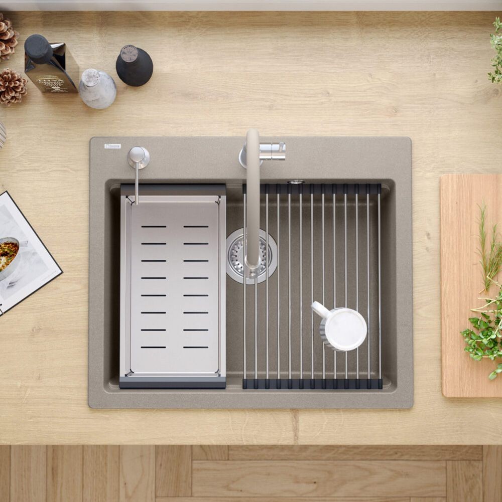 Granitový drez so svojim minimalistickým, moderným vzhľadom hodí do aranžmánu každej kuchyne. Hlboká a priestranná komora zaisťuje vysoký komfort používania. Drez, ktorý ponúkame, je skvelou voľbou pre zákazníkov, ktorí ocenia kvalitu a spracovanie. Nadčasový tvar, použitie prvotriednych materiálov a technológií, skvelý dizajn a kompatibilita použitých riešení zaručujú dokonalý konečný výsledok a vyplnia každý kuchynský priestor. K dispozícii sú rôzne farebné varianty. Tento model je veľmi bohato vybavený doplnkovými kuchynskými doplnkami. Drez je dodávaný s dávkovačom tekutín, bambusovou doskou, odkvapkávačom a valcovanou oceľovo-silikónovou podložkou.