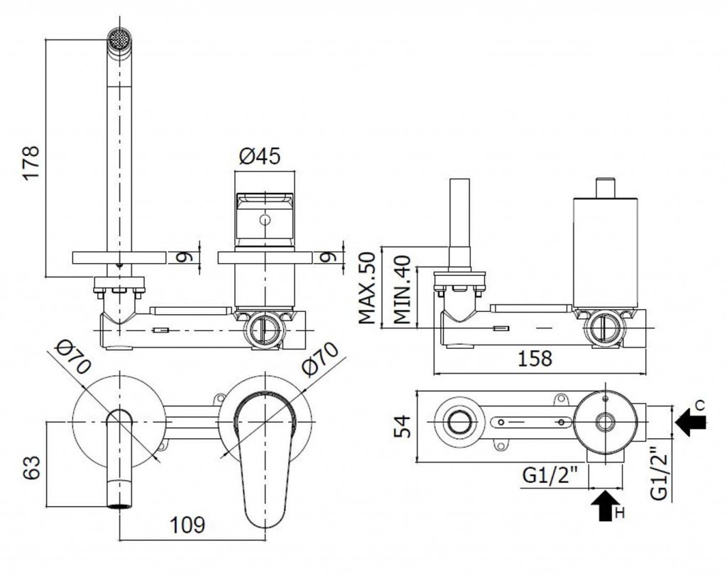 Umývadlová 2 prvková nástenná páková batéria pod omietku s telesom