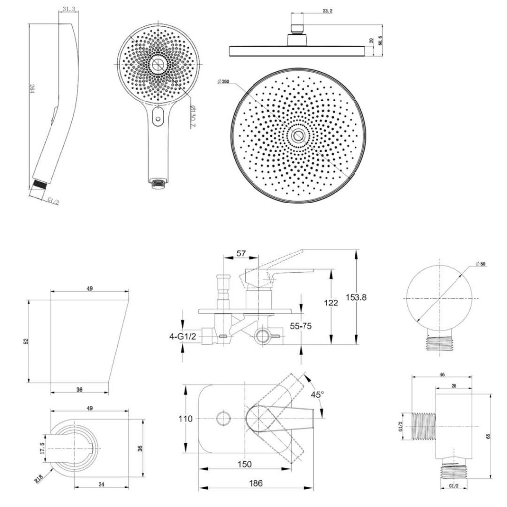 hornú sprchu 260 mm so sprchovým ramenom 350 mm