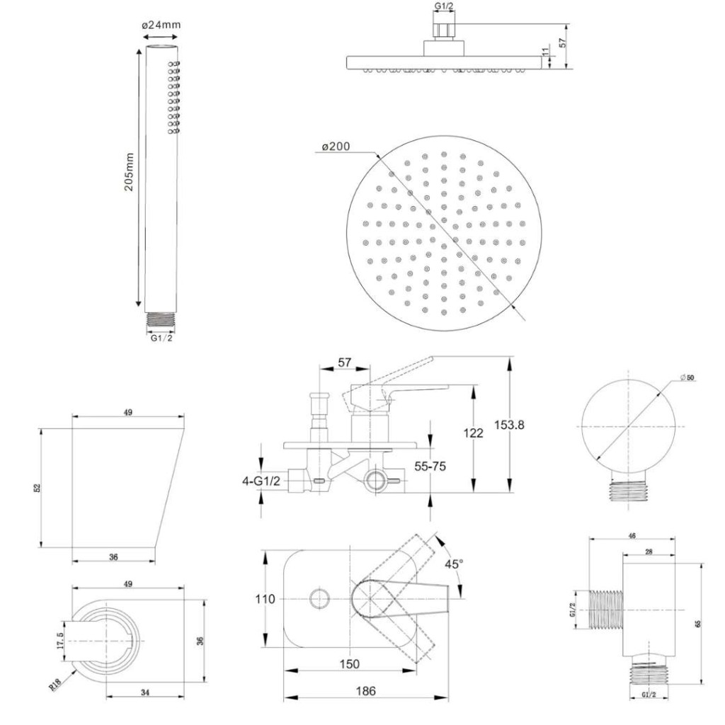 hornú sprchu 200 mm so sprchovým ramenom 350 mm