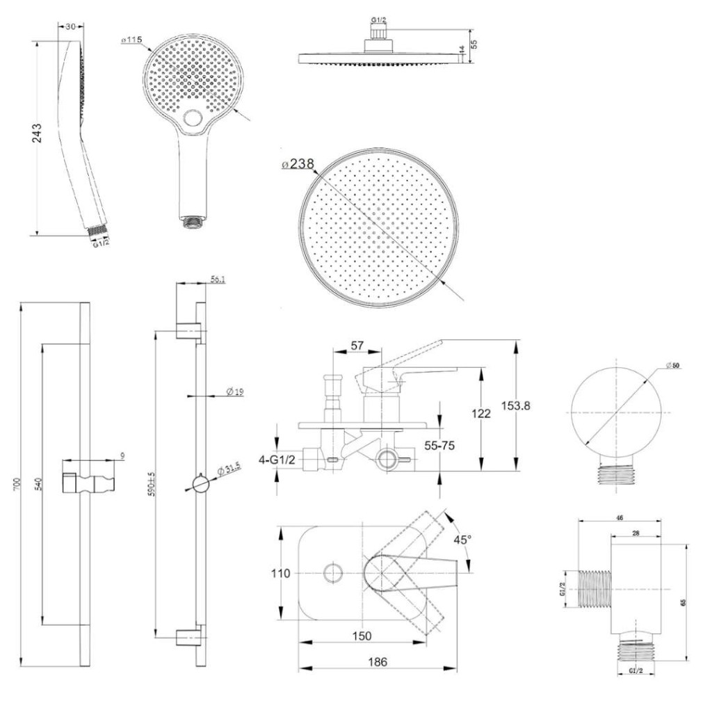 hornú sprchu 238 mm so sprchovým ramenom 350 mm