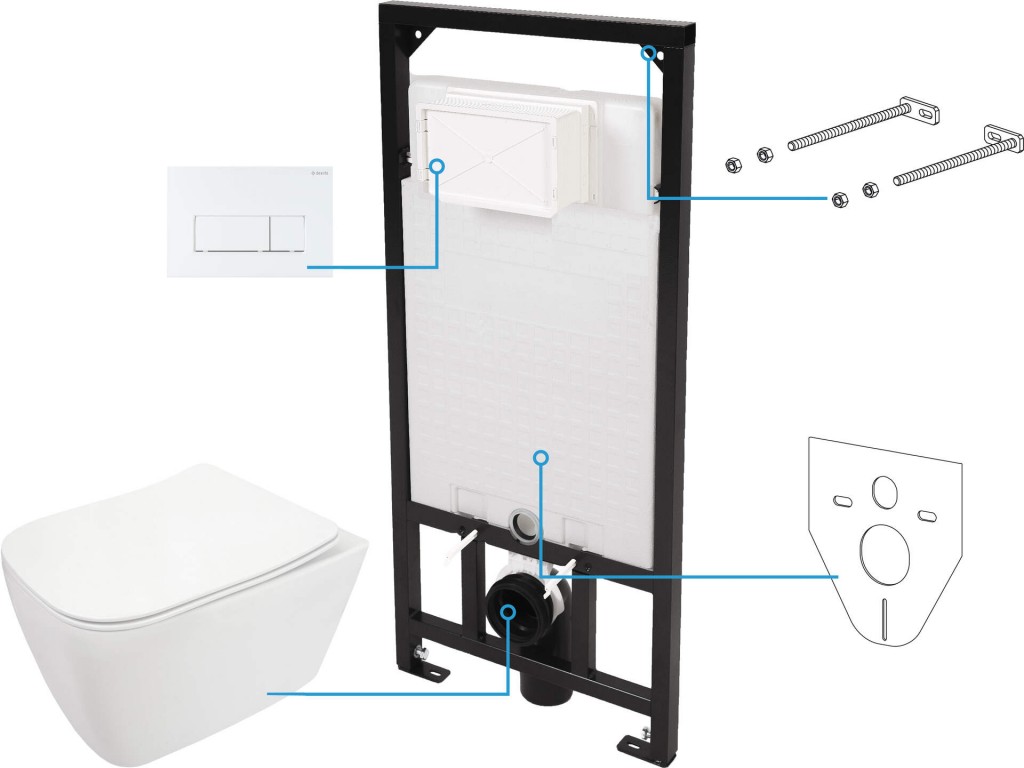 Toaletný set so závesnou misou bol navrhnutý s ohľadom na vysokú estetiku miestnosti a ľahké čistenie. Odolná, kvalitná keramika nepraská a nemení farbu ani po dlhšej dobe používania, čo potvrdil výskum Deante. Univerzálna, klasická, biela farba toaletného setu dodáva miestnosti eleganciu. Vhodné pre zapustené inštalácie. Jedná sa o kompletnú sadu 6v1, ktorá obsahuje: rám pre zapustenú montáž, toaletnú misu bez okraja, sedátko s tichým spúšťaním, elegantné splachovacie tlačidlo, podložku tlmiacu nárazy a montážne skrutky.