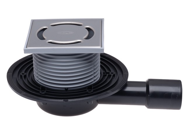 Balkonový a terasový odtok DN40/50 s vodorovným odtokem s izolační přírubou, nezámrzná a protizápachová klapka, výškově stavitelný nástavec 12 - 70 mm / 123 x 123 mm a mřížka z nerzové oceli115 x 115 mm také kryt rámečku a stavební kryt vtoku v balení.