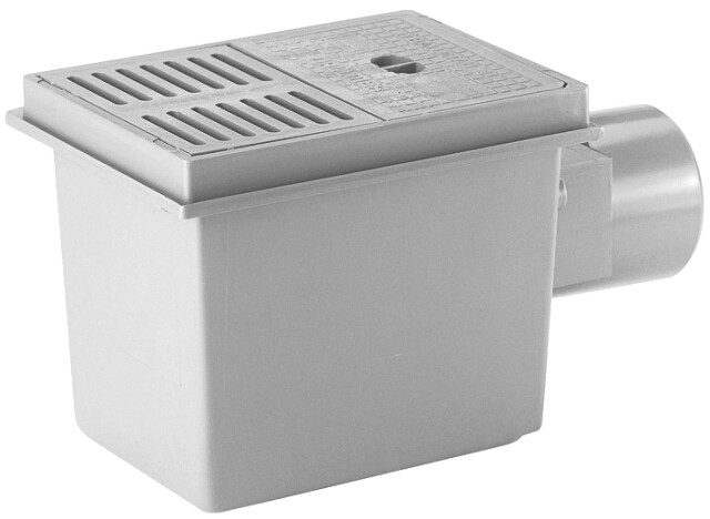 Podlahová vpust DN110 s vodorovným odtokem, s 3 – násobným uzávěrem proti vzduté vodě, s plastovou vtokovou mřížkou 180 x 125mm, s lapačem nečistot