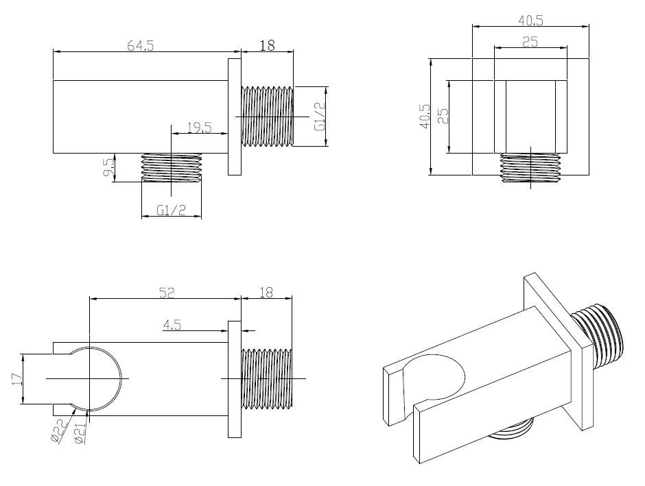 Hranatý vývod zo steny s držiakom sprchy z prvotriedneho materiálu. Stenový vývod je určený p ro kombinácii s podomietkovú batériou - sprchovú aj vaňovú. Súčasťou konštrukcie je aj držiak na ručnú sprchu bez možnosťou polohovania. Nemusíte tak už nijako zasahovať do obkladov v kúpeľni.