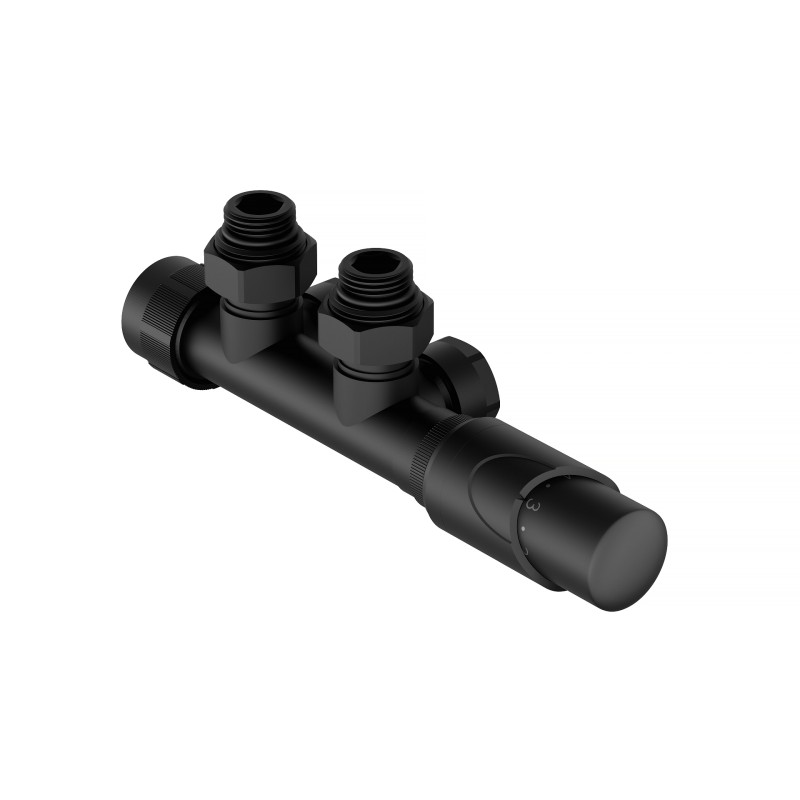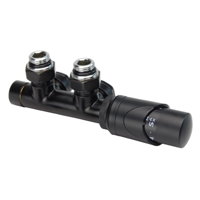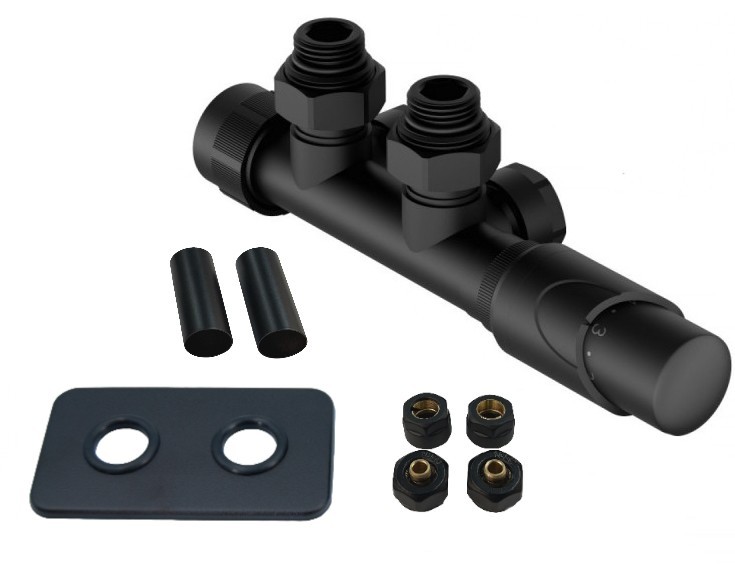Stredová obojstranná (ľavá aj pravá) termostatická sada HYBRID vr. krycie rozety a 2 krycích trubičiek (mosadz) je určená na pripojenie radiátorov na rozvody TÚV s vývodom zo steny s rozstupom 50mm.