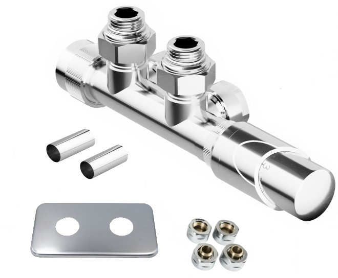 Stredová obojstranná (ľavá aj pravá) termostatická sada HYBRID vr. krycie rozety a 2 krycích trubičiek (mosadz) je určená na pripojenie radiátorov na rozvody TÚV s vývodom zo steny s rozstupom 50mm.