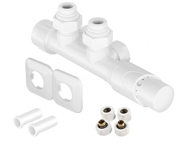 Stredová obojstranná (ľavá aj pravá) termostatická sada HYBRID vr. krycie rozety a 2 krycích trubičiek (plast) je určená na pripojenie radiátorov na rozvody TÚV s vývodom zo steny s rozstupom 50mm.