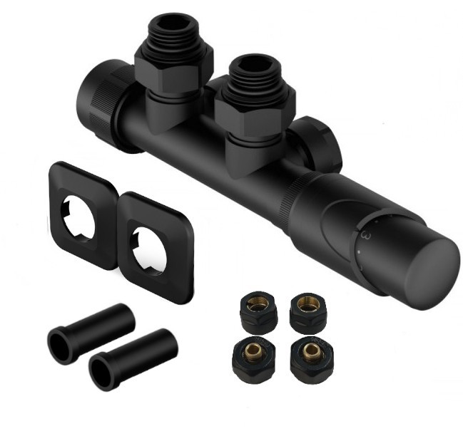 Stredová obojstranná (ľavá aj pravá) termostatická sada HYBRID vr. krycie rozety a 2 krycích trubičiek (plast) je určená na pripojenie radiátorov na rozvody TÚV s vývodom zo steny s rozstupom 50mm.