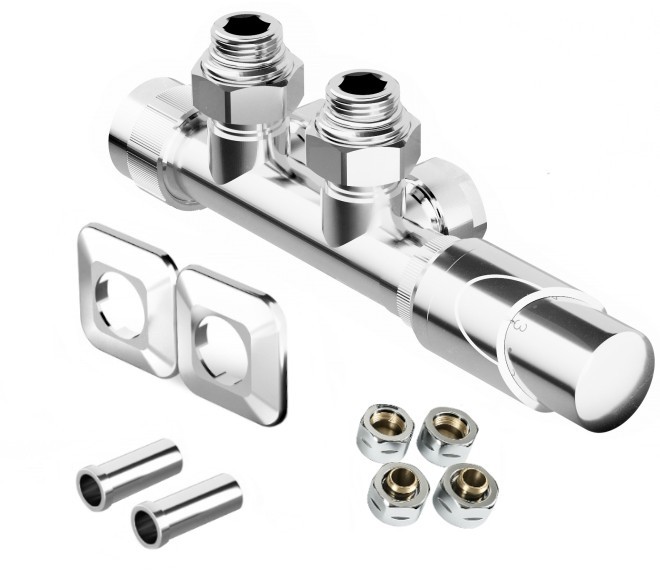 Stredová obojstranná (ľavá aj pravá) termostatická sada HYBRID vr. krycie rozety a 2 krycích trubičiek (plast) je určená na pripojenie radiátorov na rozvody TÚV s vývodom zo steny s rozstupom 50mm.