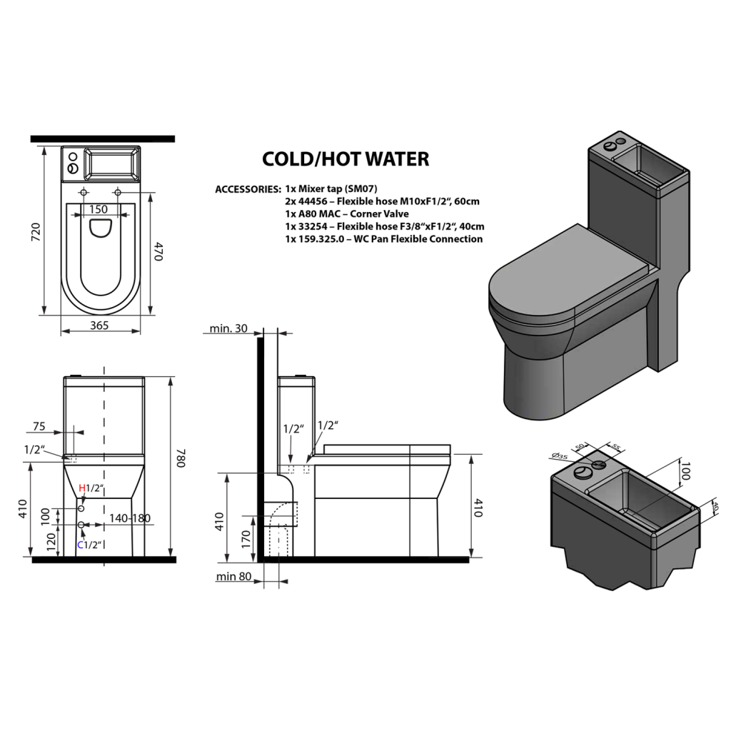 Pripojenie vody k ventilu je cez nádržku, ktorá má spodné napúšťanie, sú k nej 2 prívody vody.
