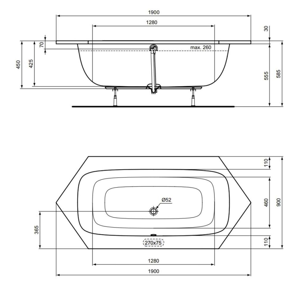 Nožičky a odtoková súprava nie sú súčasťou dodávky.