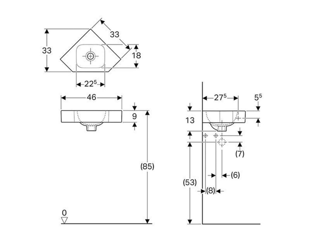 Rohové umývadlo bez prepadu a bez otvoru pre batériu