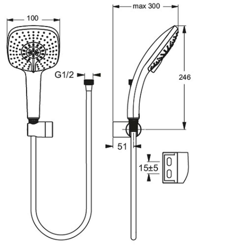 - ručnú sprchu s tromi druhmi prúdu, rozmer hlavice 100x100 mm