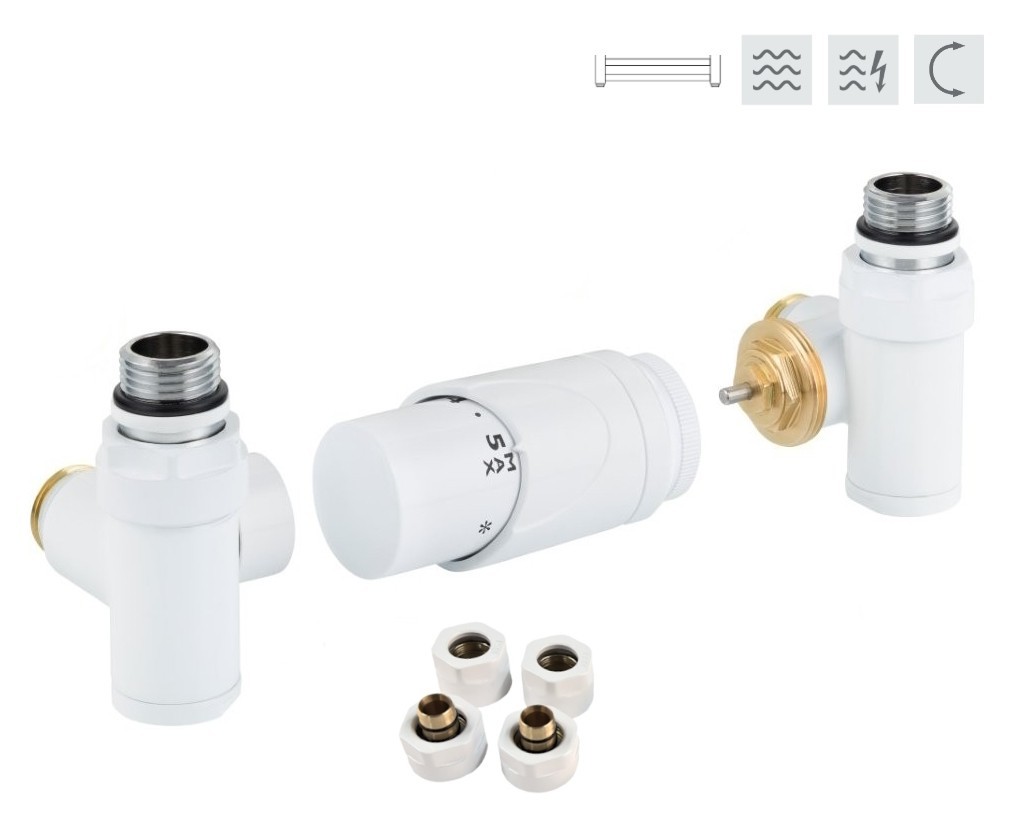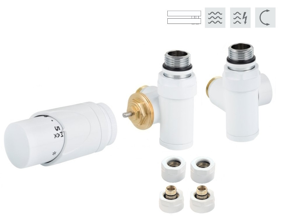 Rohový pripojovací ventil INTEGRATO-SADA (Z8) je určený pre vykurovacie telesá s klasickým (krajným - na rozstup) pripojením, najmä pre kúpeľňové telesá – tzn. rebríky, ktoré umožňujú priame osadenie elektrickej vykurovacej tyče . Termostatický ventil, regulačné šróbenie, termostatická hlavica je k dispozícii v 3 farbách vždy s veľmi kvalitnou povrchovou úpravou. Prívod je vždy na strane termostatickej hlavice. Ventily dodávame vrátane zverného šróbenia na Cu aj na PEX-AL-PEX.