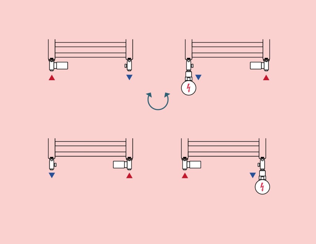 Pre kombinovanú prevádzku musíte objednať ventilovú sadu + elektrickú vykurovaciu tyč v odporúčanom výkone, ktorú môžete inštalovať cez ventil vľavo alebo vpravo do radiátora.