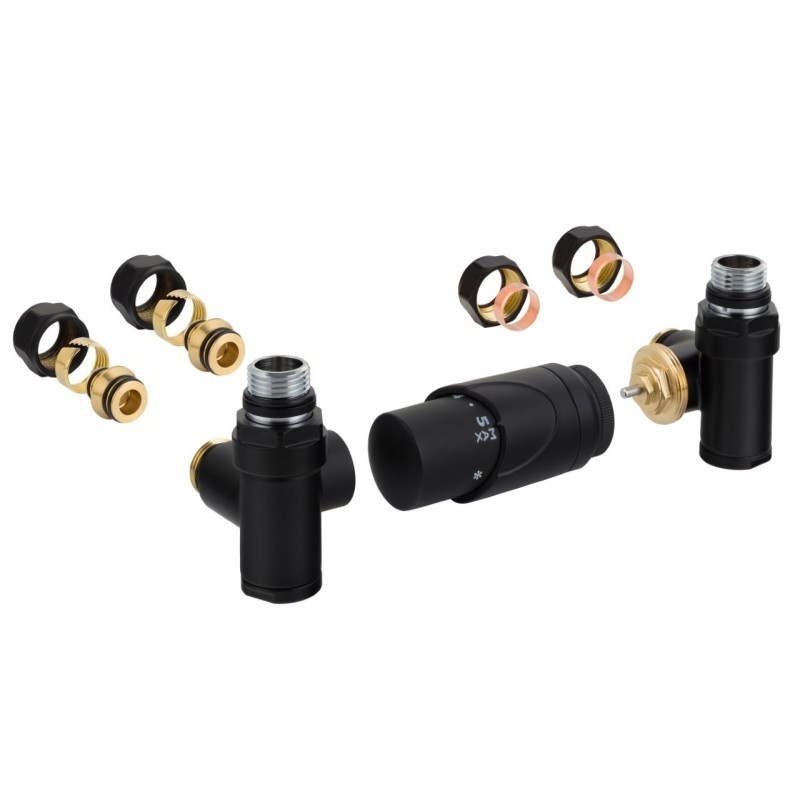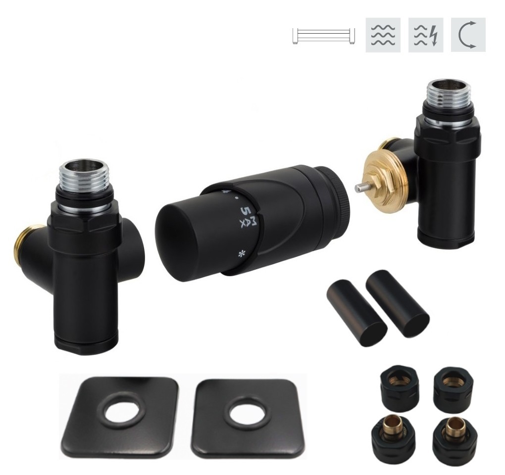 Rohová obojstranná (ľavá aj pravá) termostatická sada INTEGRATO vr. krycie rozety a 2 krycích trubičiek (mosadz) je určená na pripojenie radiátorov na rozvody TÚV s vývodom zo steny s rôznym rozstupom (krajné pripojenie). Súprava umožňuje priame osadenie elektrickej vykurovacej tyče.