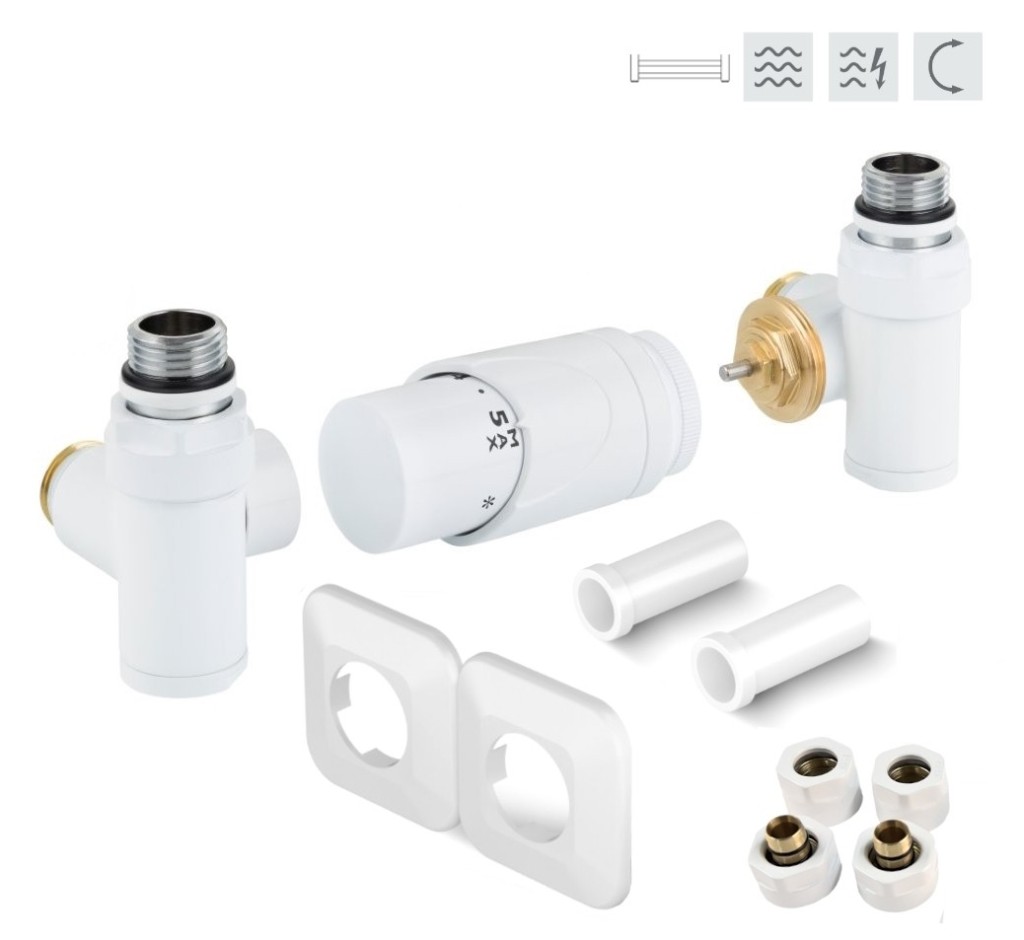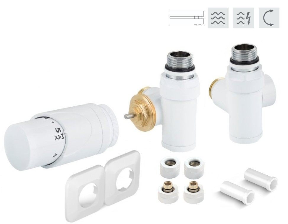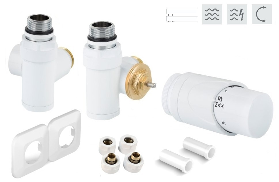 Rohová obojstranná (ľavá aj pravá) termostatická sada INTEGRATO vr. krycie rozety a 2 krycích trubičiek (plast) je určená na pripojenie radiátorov na rozvody TÚV s vývodom zo steny s rôznym rozstupom (krajné pripojenie). Súprava umožňuje priame osadenie elektrickej vykurovacej tyče.