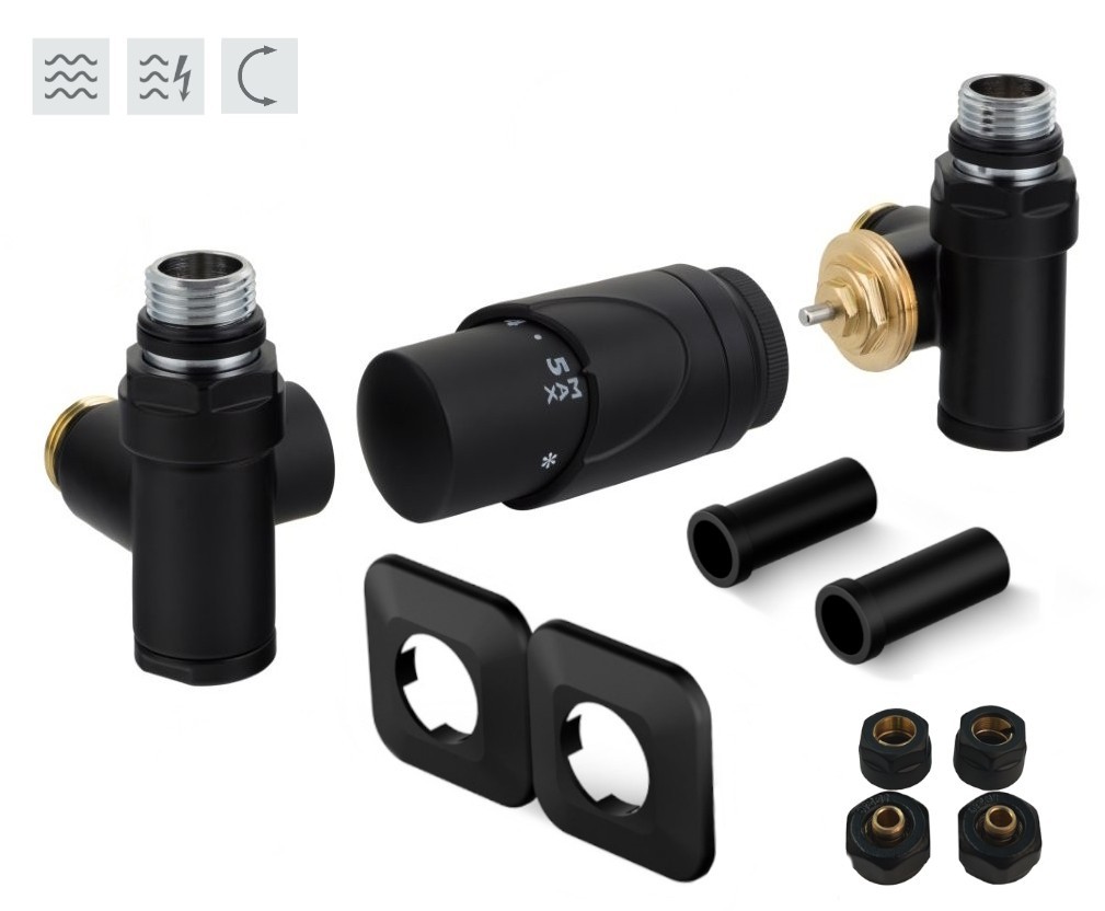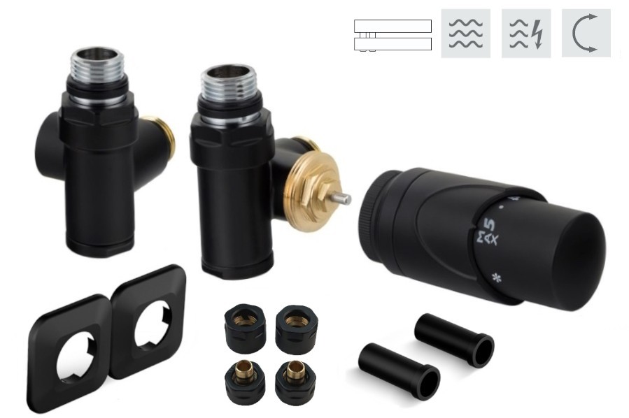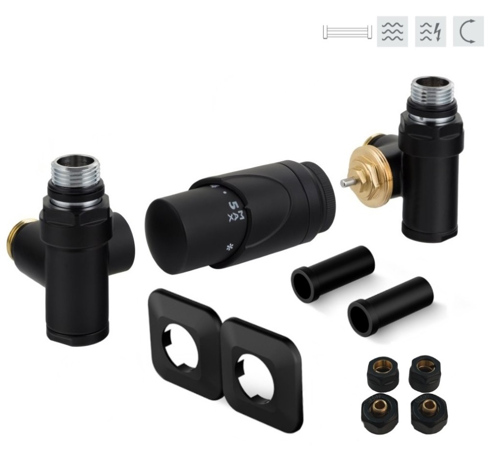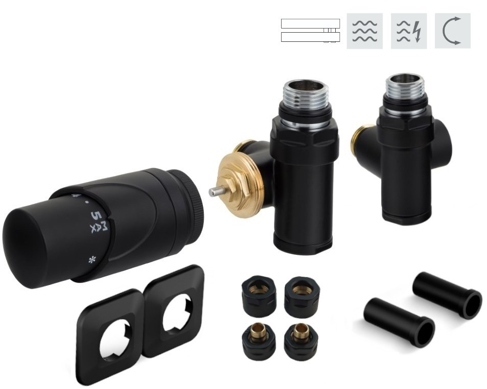 Rohová obojstranná (ľavá aj pravá) termostatická sada INTEGRATO vr. krycie rozety a 2 krycích trubičiek (plast) je určená na pripojenie radiátorov na rozvody TÚV s vývodom zo steny s rôznym rozstupom (krajné pripojenie). Súprava umožňuje priame osadenie elektrickej vykurovacej tyče.