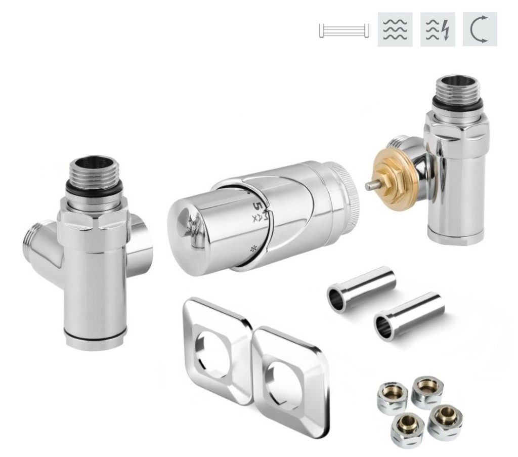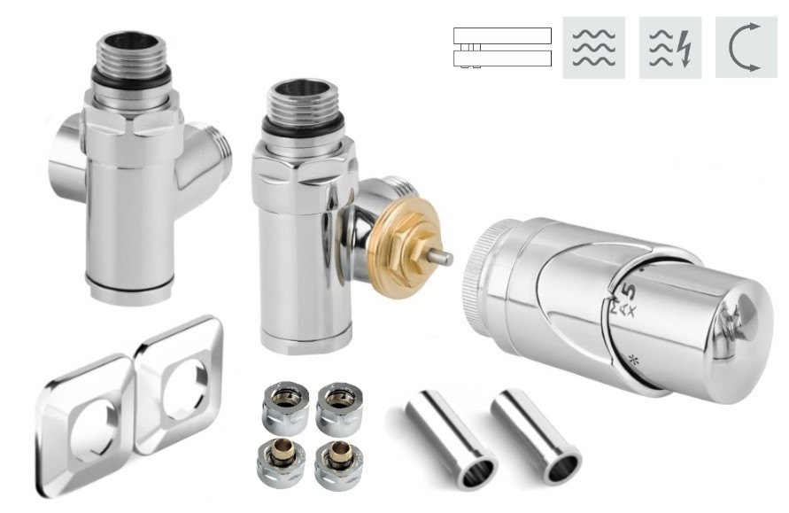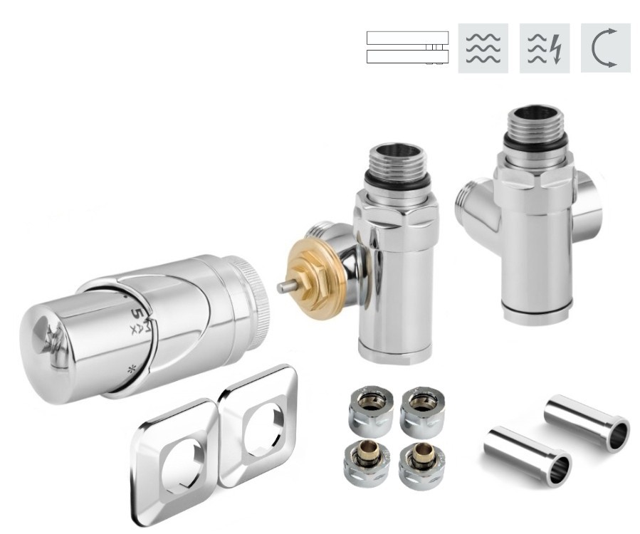 Rohová obojstranná (ľavá aj pravá) termostatická sada INTEGRATO vr. krycie rozety a 2 krycích trubičiek (plast) je určená na pripojenie radiátorov na rozvody TÚV s vývodom zo steny s rôznym rozstupom (krajné pripojenie). Súprava umožňuje priame osadenie elektrickej vykurovacej tyče.