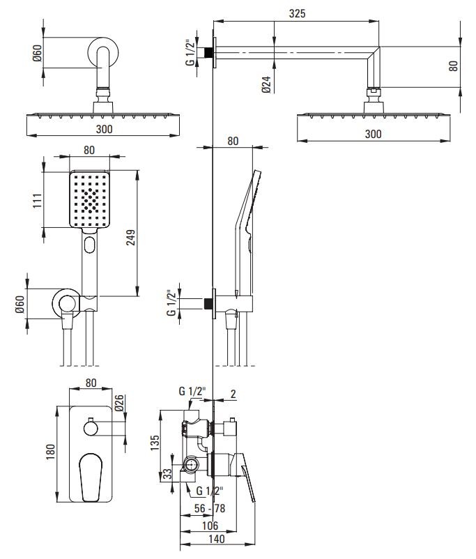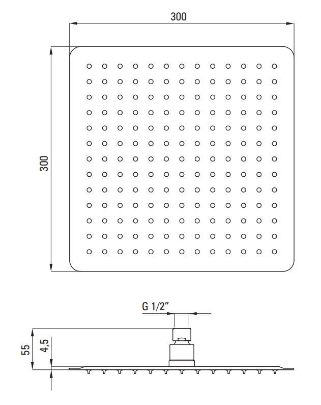 - oceľová hlavová sprcha ( NAC_209K ) s jednou funkciou o veľkosti 300 x 300 mm so systémom Anti-calc, ktorý uľahčuje odstraňovanie vodného kameňa