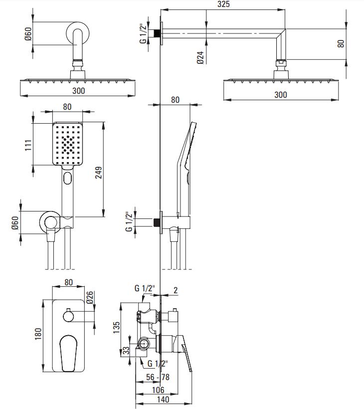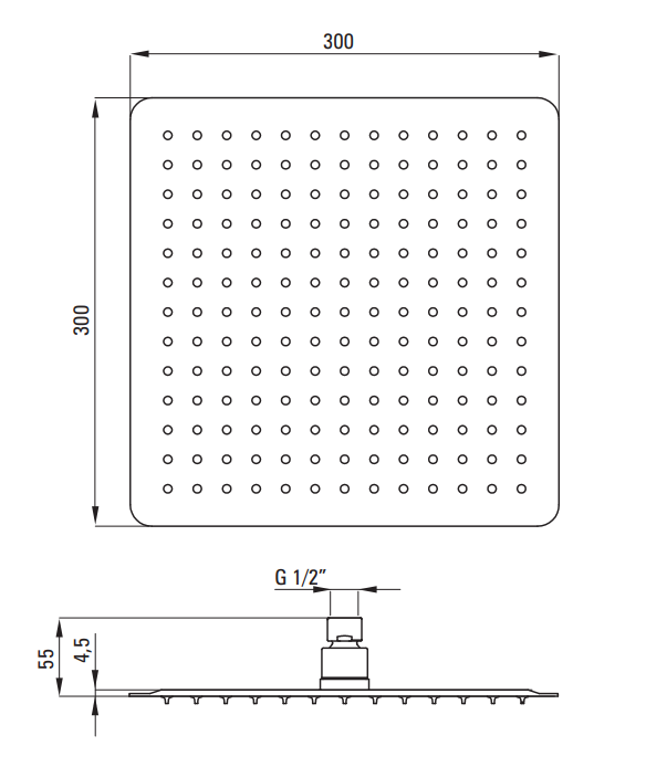- sprchové rameno s oceľovou štvorcovou hlavovou sprchou o rozmere 300x300 mm s Anti-calc systémom