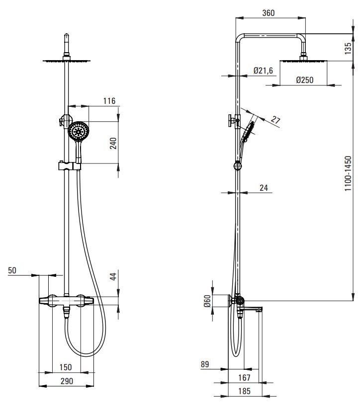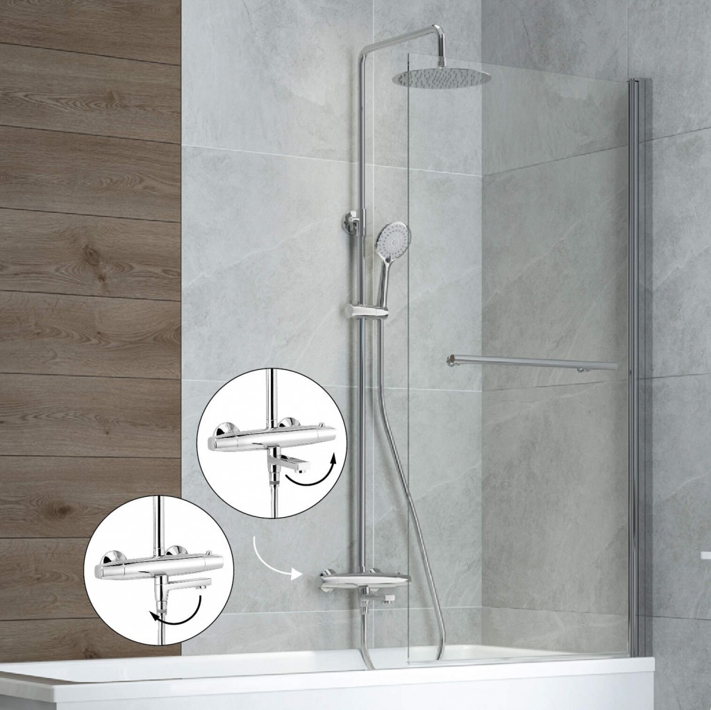 • termostatická vaňová batéria s rozstupom 15 cm má pohyblivý výtok slúžiaci ako prepínač, vybavená je spätnými ventilmi, vďaka ktorým namiešaná voda nepreteká späť do systému
