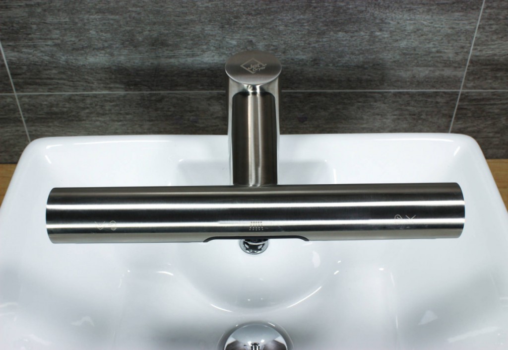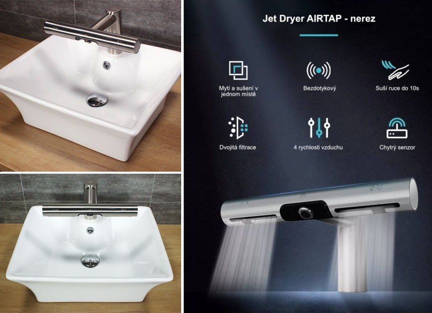 Inovatívny dizajn sušiča Jet Dryer AIRTAP - Brushed kombinuje tryskový sušič s automatickou vodovodnou batériou. Ruky si tak môžete pohodlne umyť aj vysušiť na jednom mieste – priamo v umývadle. Jet Dryer AIRTAP - Brushed je vybavený HEPA filtrom. Vodovodné batérie aj sušič je bezkontaktný pre maximálne hygienickú prevádzku. Vďaka tomu, že má každé umývadlo svoj sušič, prevádzka na toaletách je plynulá a bez front.