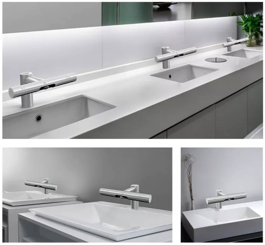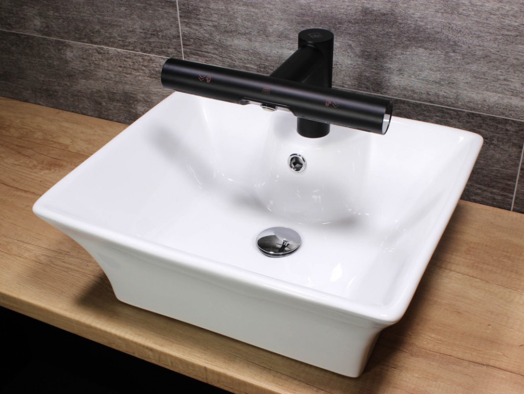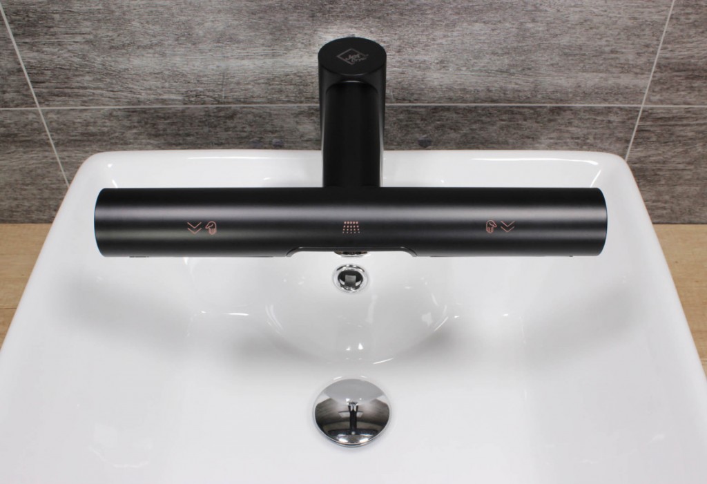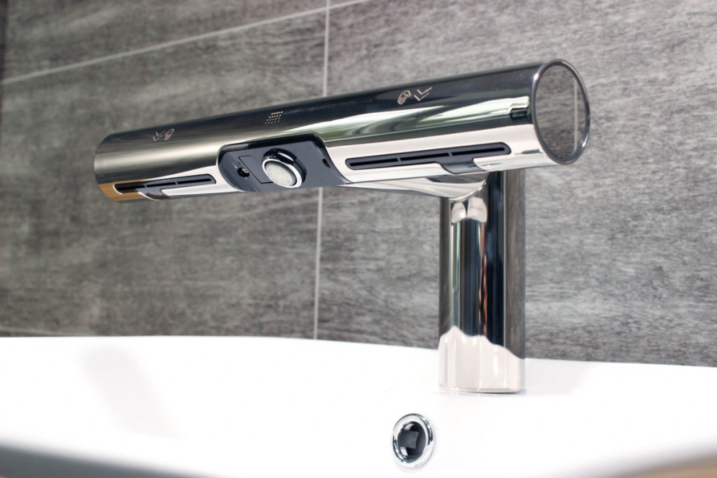 Inovatívny dizajn pre jednoduché použitieHygienické umytie a osušenie rúk nebolo nikdy jednoduchšie. Vložením rúk pod vodovodnú batériu začne automaticky tiecť voda s vopred nastavenou teplotou. Uprostred automatickej batérie sa nachádza vyústenie trysky sušiča. Spustenie je tiež bezkontaktné, stačí vsunúť ruky a pohybovať s nimi podobne ako pri umývaní.