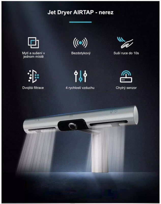Inovatívny dizajn sušiča Jet Dryer AIRTAP - Brushed kombinuje tryskový sušič s automatickou vodovodnou batériou. Ruky si tak môžete pohodlne umyť aj vysušiť na jednom mieste – priamo v umývadle. Jet Dryer AIRTAP - Brushed je vybavený HEPA filtrom. Vodovodné batérie aj sušič je bezkontaktný pre maximálne hygienickú prevádzku. Vďaka tomu, že má každé umývadlo svoj sušič, prevádzka na toaletách je plynulá a bez front.