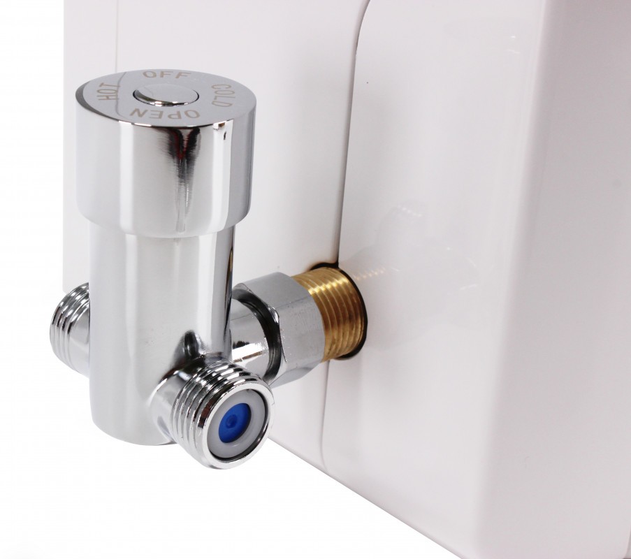 Súčasťou každého balenia sušiča rúk s vodovodnou batériou 2v1 je zmiešavací ventil umožňujúci nastavenie príjemnej teploty vody. Jet Dryer DUO je tiež možné rovno pripojiť iba na studenú vodu.