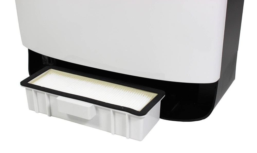 Uchopte a vysuňte odkvapovú nádobku z prístroja - vzduchový filter nájdete za odkvapovou nádobkou. Za úchyt na tele filtra vysuňte HEPA filter z prístroja ťažným pohybom k sebe.