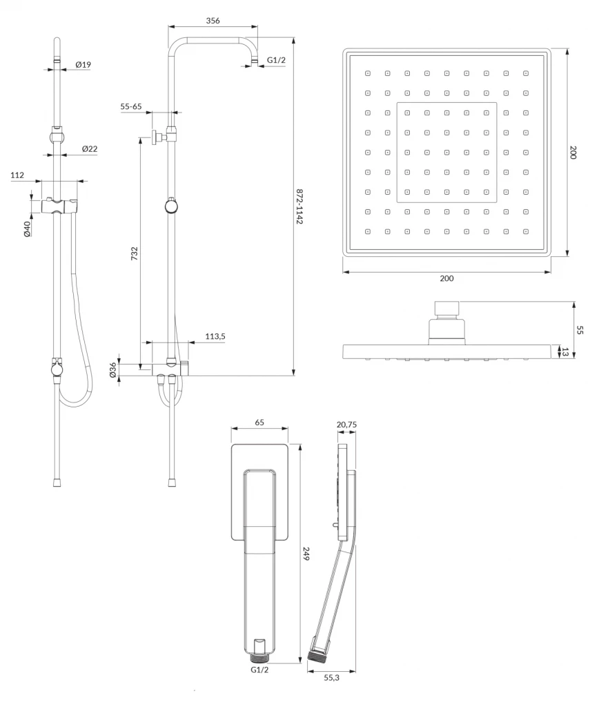 - sprchový stĺp s prepínačom a ramenom dažďovej sprchy