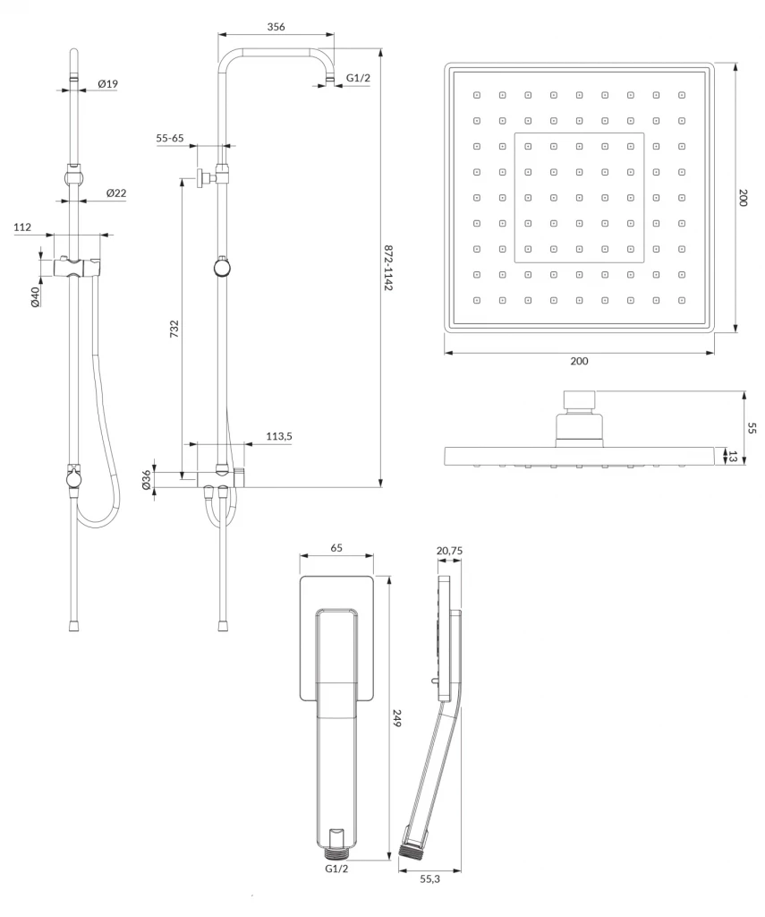 - dažďová sprcha, rozmer: 20 x 20 cm, dosah ramien od steny: ~41 cm